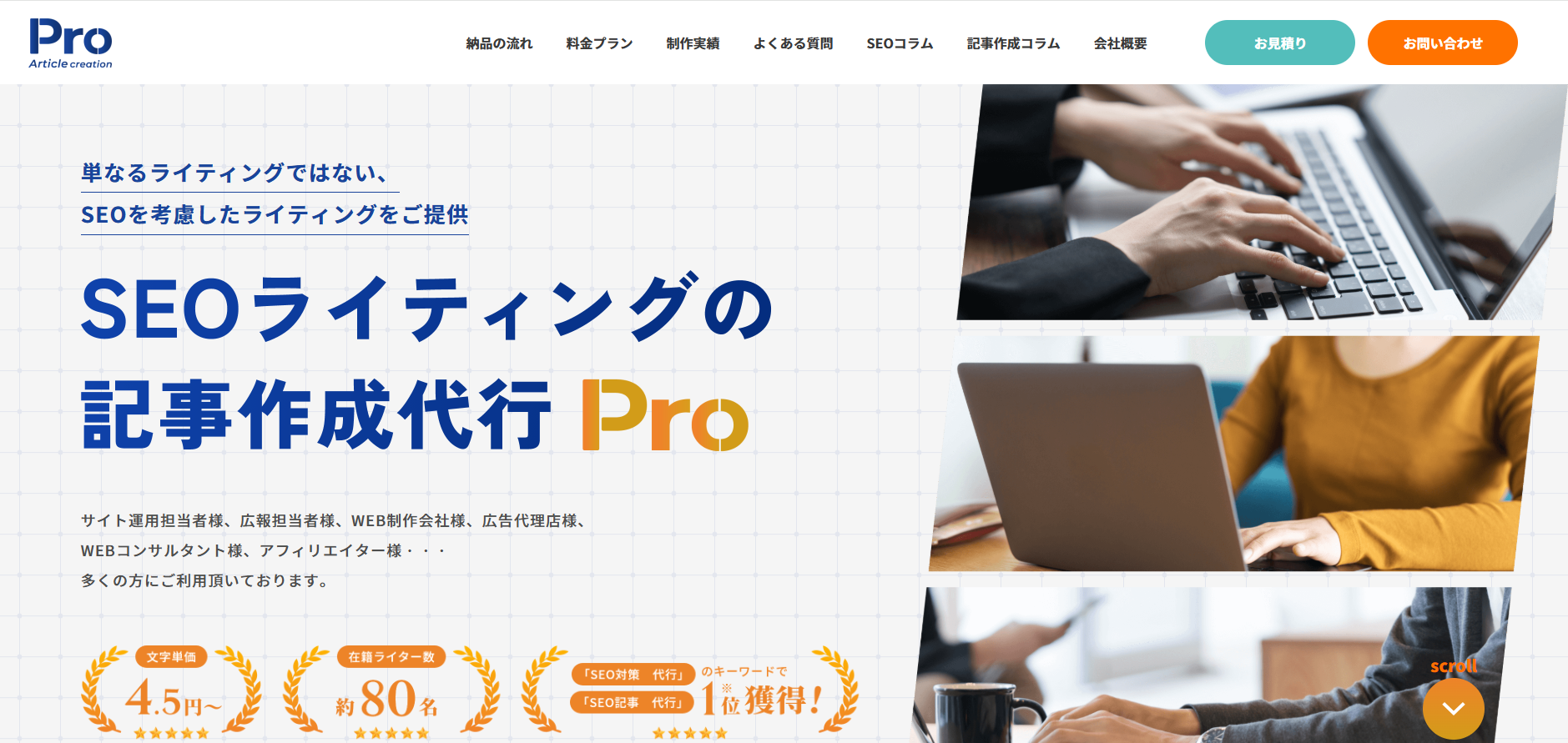 専任のディレクターを校正者によるしっかりとした校正チェックが入る 安心してお任せできるプランになります。 | 現在のサイト検索順位などを独自の方法で徹底的に分析し、それを元にキーワードの算出・記事の作成を行うプランです。 | キーワードはもちろん現在のサイトのどこが良くてどこが悪いかを分析し、分析データを元に過去の記事のリライトや記事の量産を行っていくプランです。 | 全て一貫してお任せできるプランです。入念なヒアリングを元に、SEOコンサルティング・Webデザイン・キーワード選定や記事企画・インタビューや商品モニター記事・専門家監修記事など、さまざまなニーズにお応えできます。 |